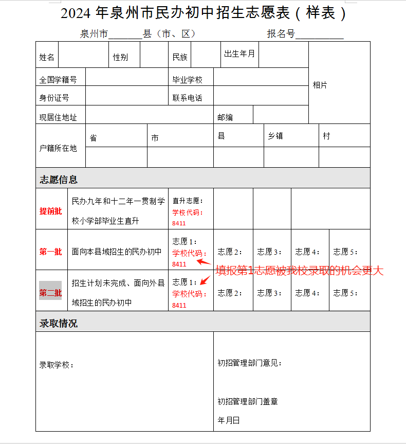 我校依据《泉州市教育局关于印发《2024年泉州市初中招生入学工作方案》的通知》(泉教中〔2024〕10号)文件精神,坚持依法招生、规范招生、阳光招生,严格遵守并全面落实义务教育免试入学的要求,依法保障适龄儿童少年接受义务教育的权利,坚持公民同步,自愿报名,电脑随机派位录取的招生原则。