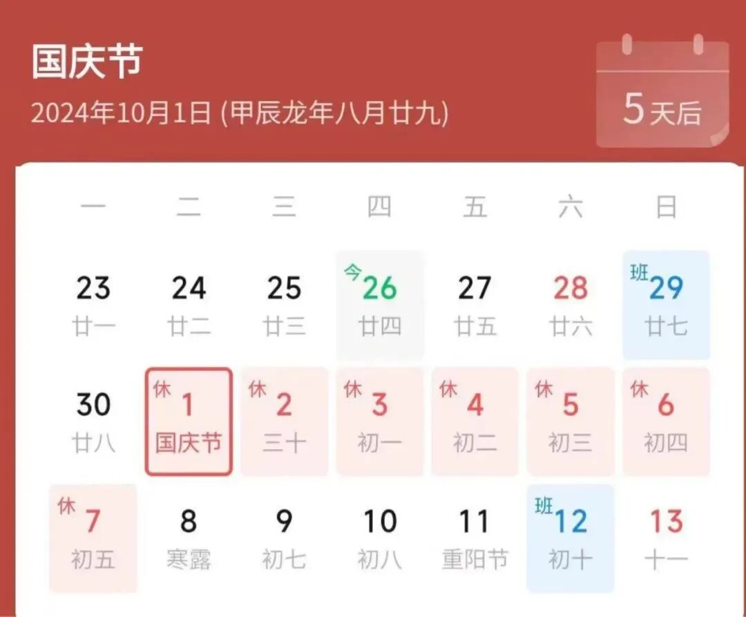 根据《国务院办公厅关于2024年部分节假日安排的通知》,放假时间为:2024年10月1日(星期二)至2024年10月7日(星期一)放假,共7天。