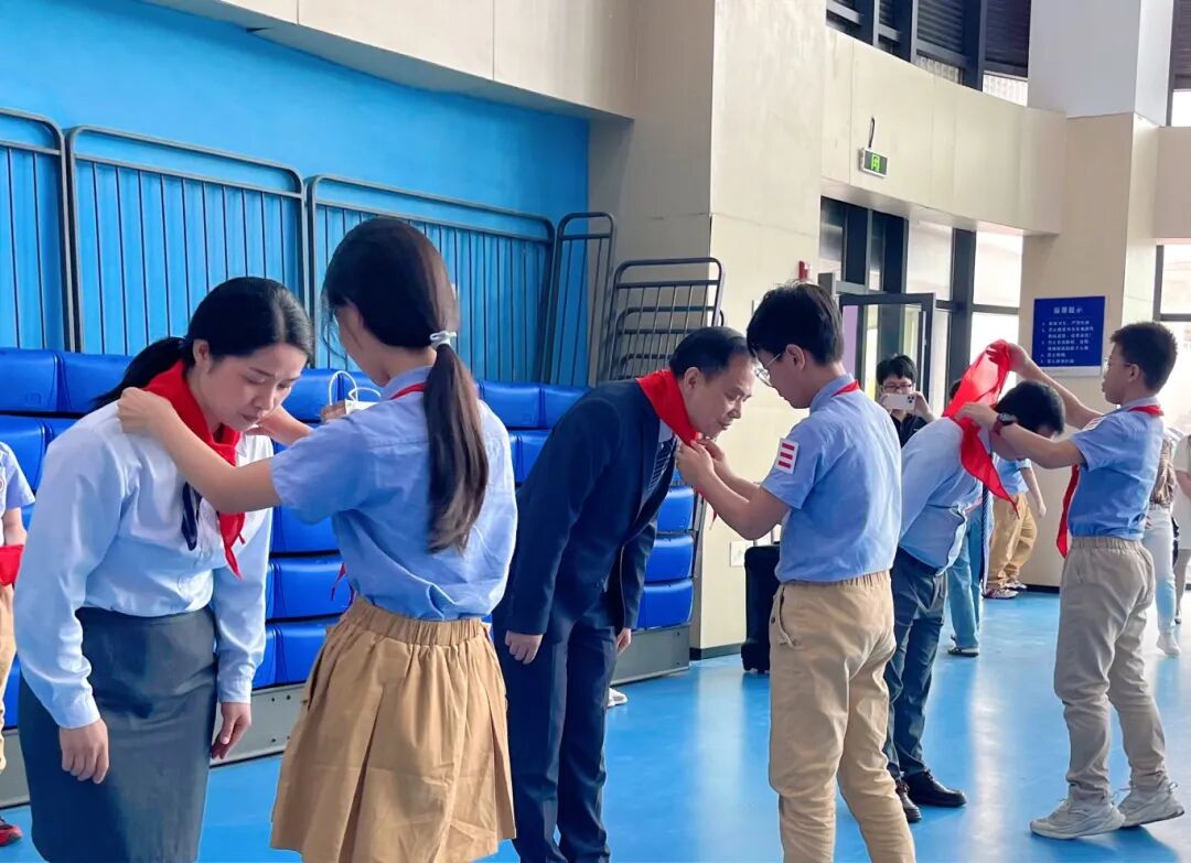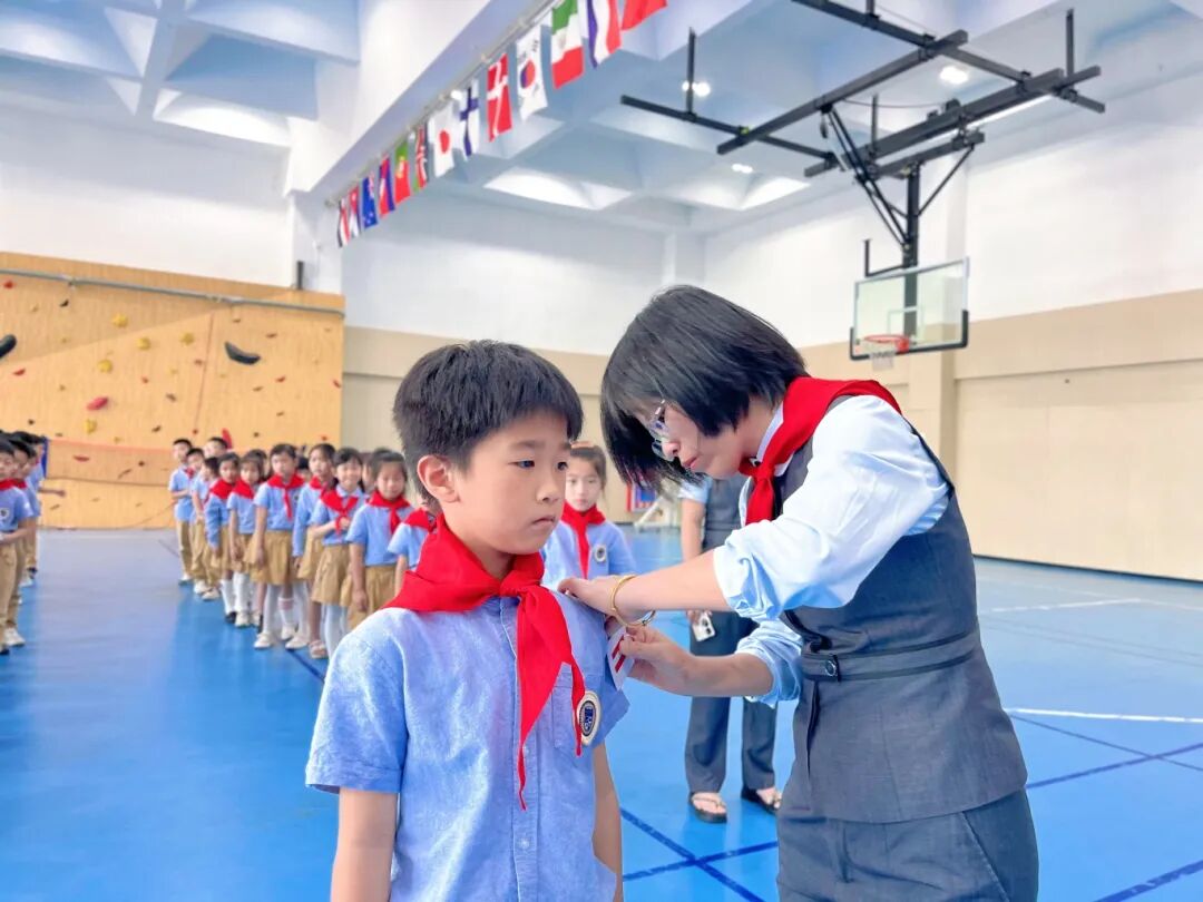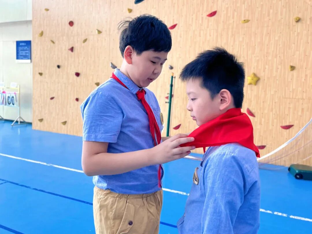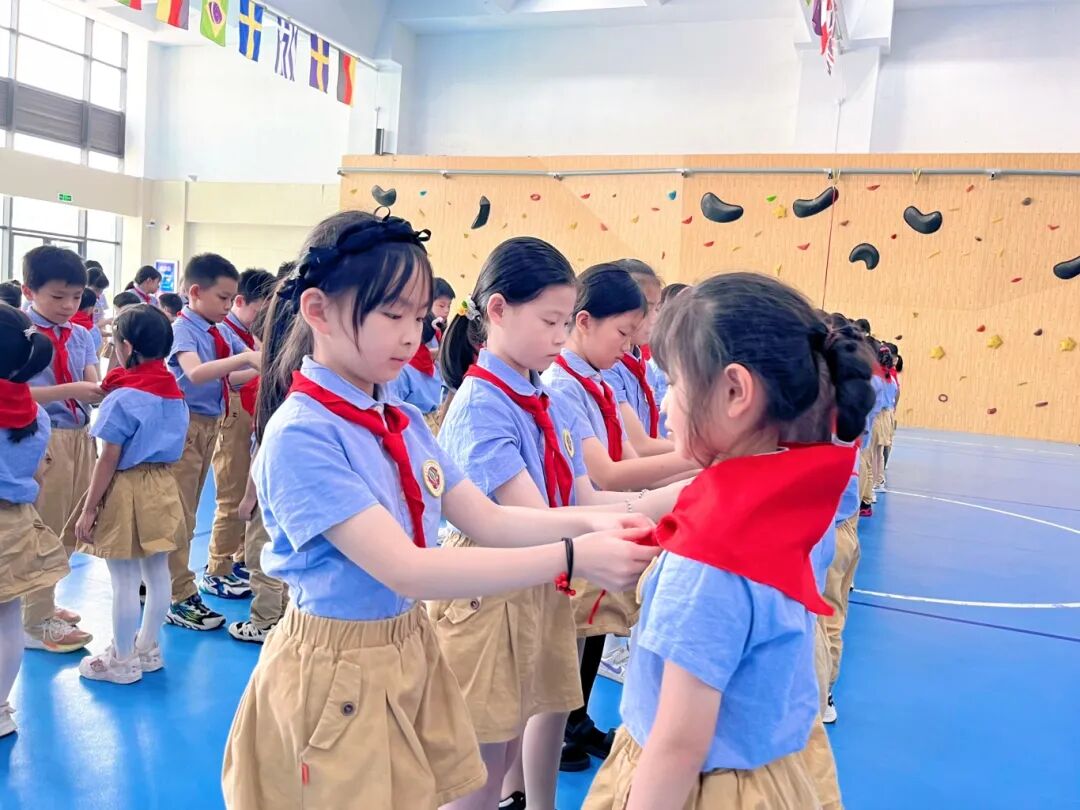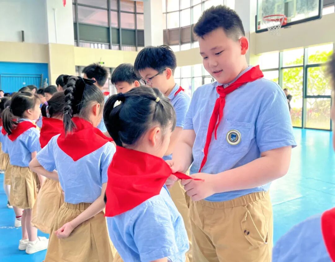 最激动人心的时刻到来了,四年级的哥哥姐姐们手捧鲜艳的红领巾,郑重地为新队员佩戴。他们动作娴熟,神情专注,将红领巾系在新队员的脖颈上,并细心地整理好。新队员们挺起胸膛,脸上洋溢着光荣与自豪的笑容。鲜艳的红领巾在微风中轻轻飘动,映衬着他们纯真的脸庞,也让他们深刻意识到,从这一刻起,自己正式成为了一名光荣的少先队员,要肩负起更多的责任与使命。