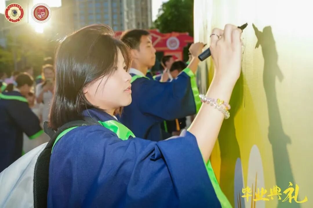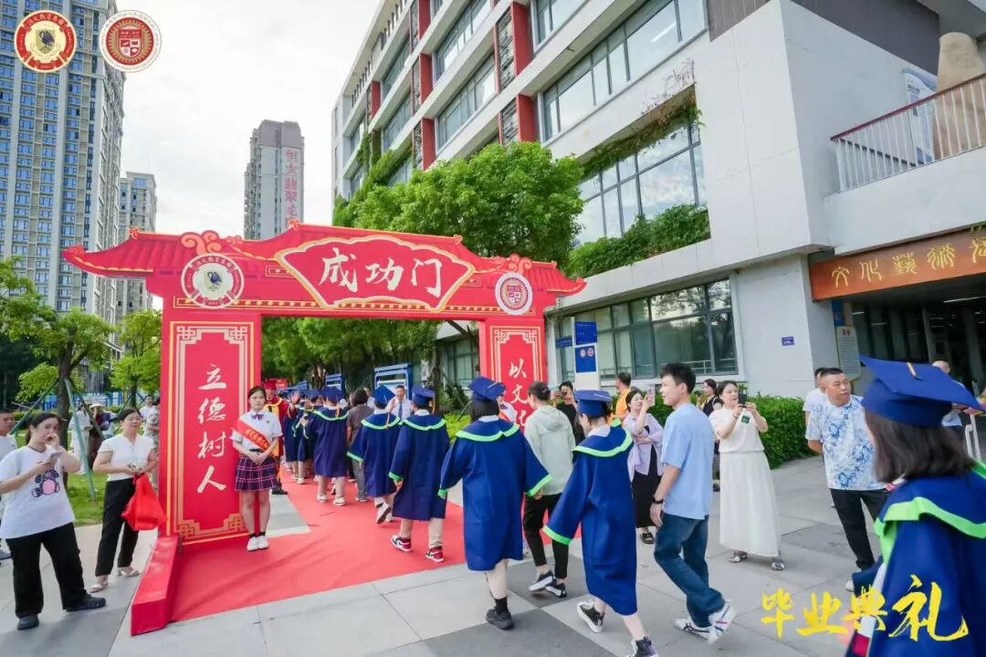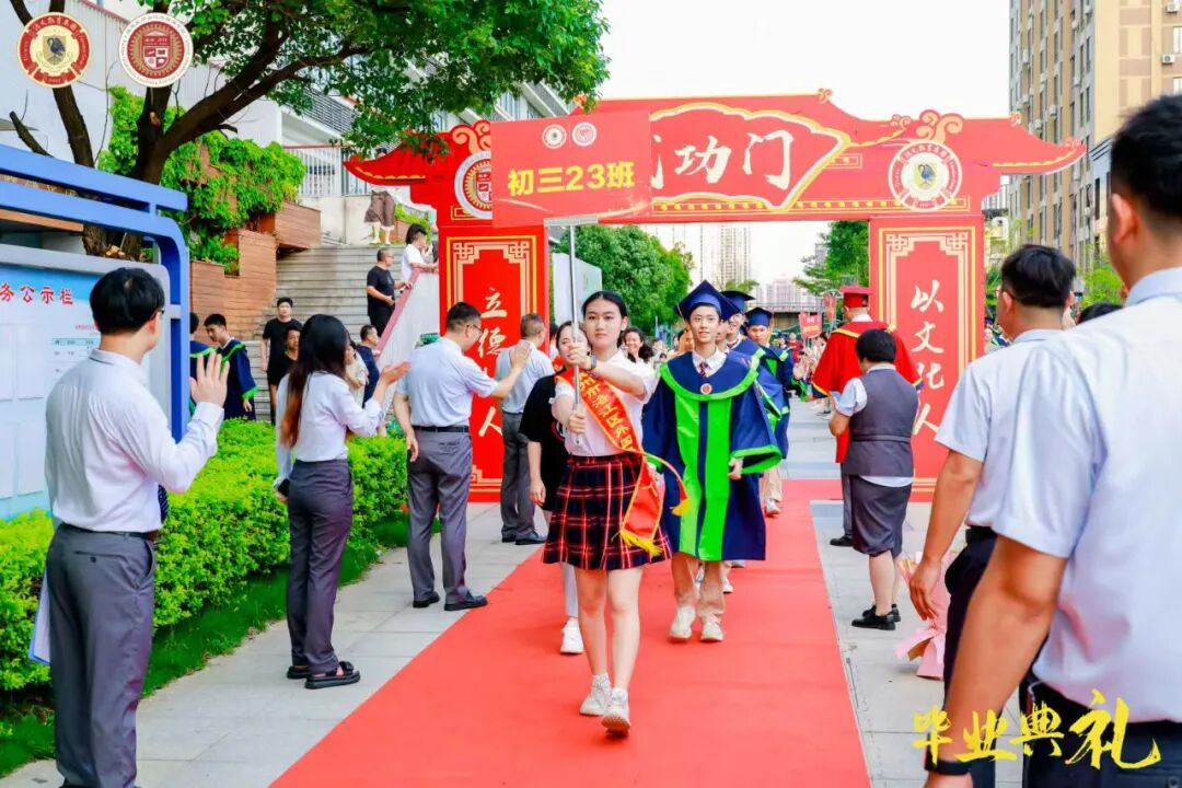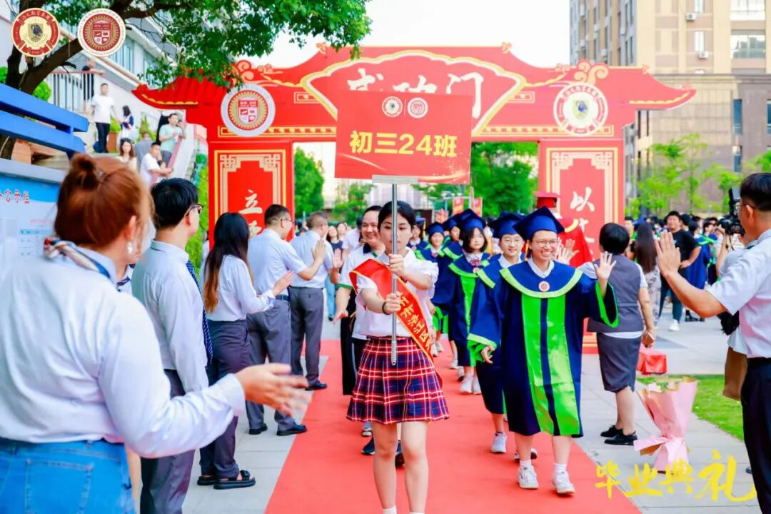签字墙前,学生纷纷留下自己的姓名,这是他们初中生涯的最后一笔,也是他们人生旅程中重要的一页。学生和家长共同穿过成功门,与拱门两侧的校领导及恩师击掌为誓。