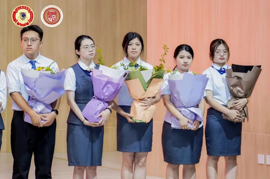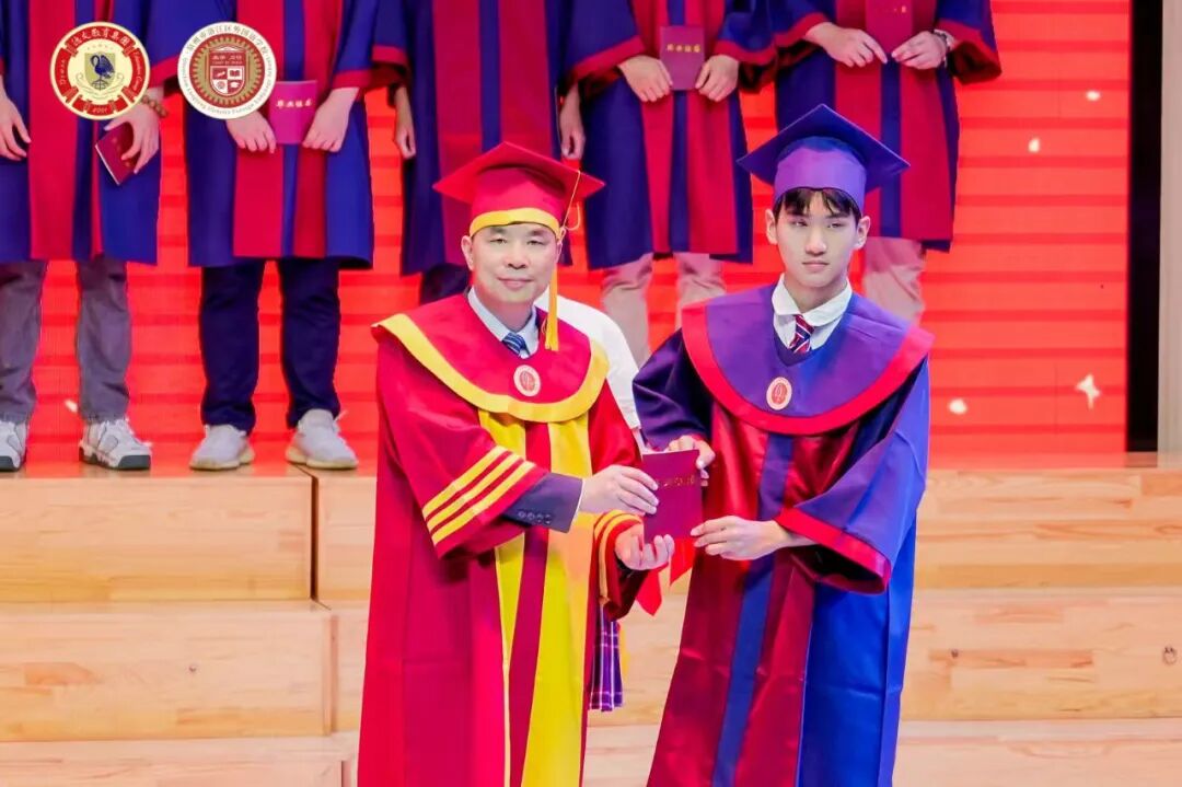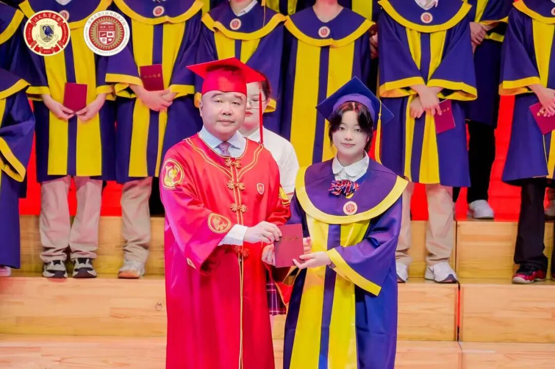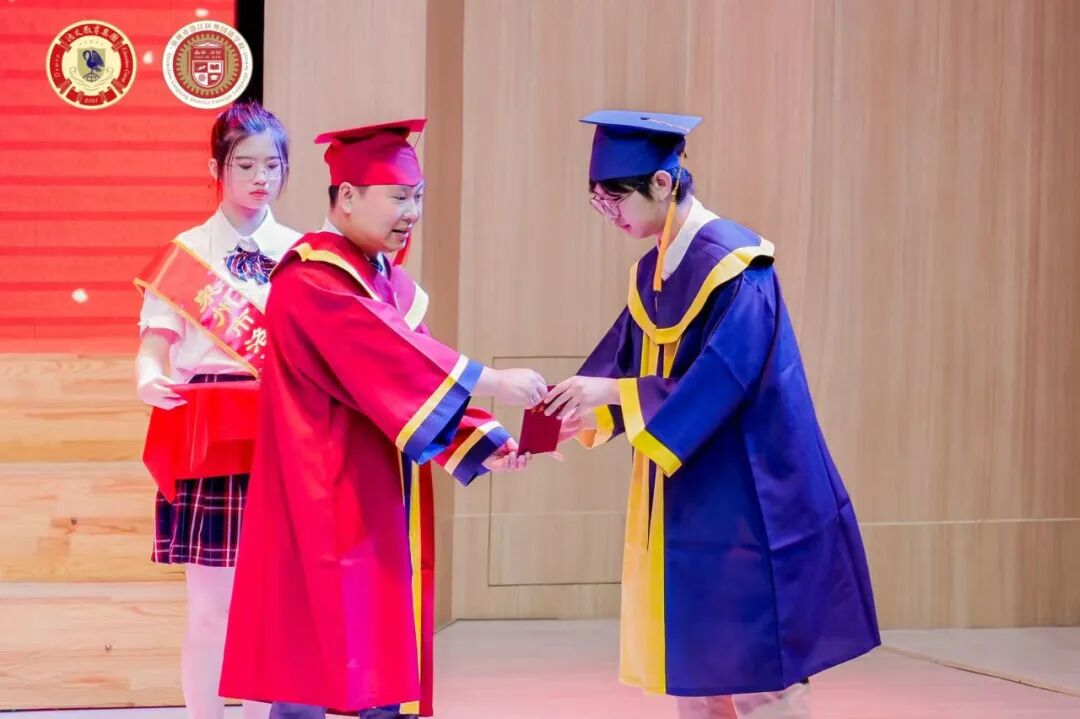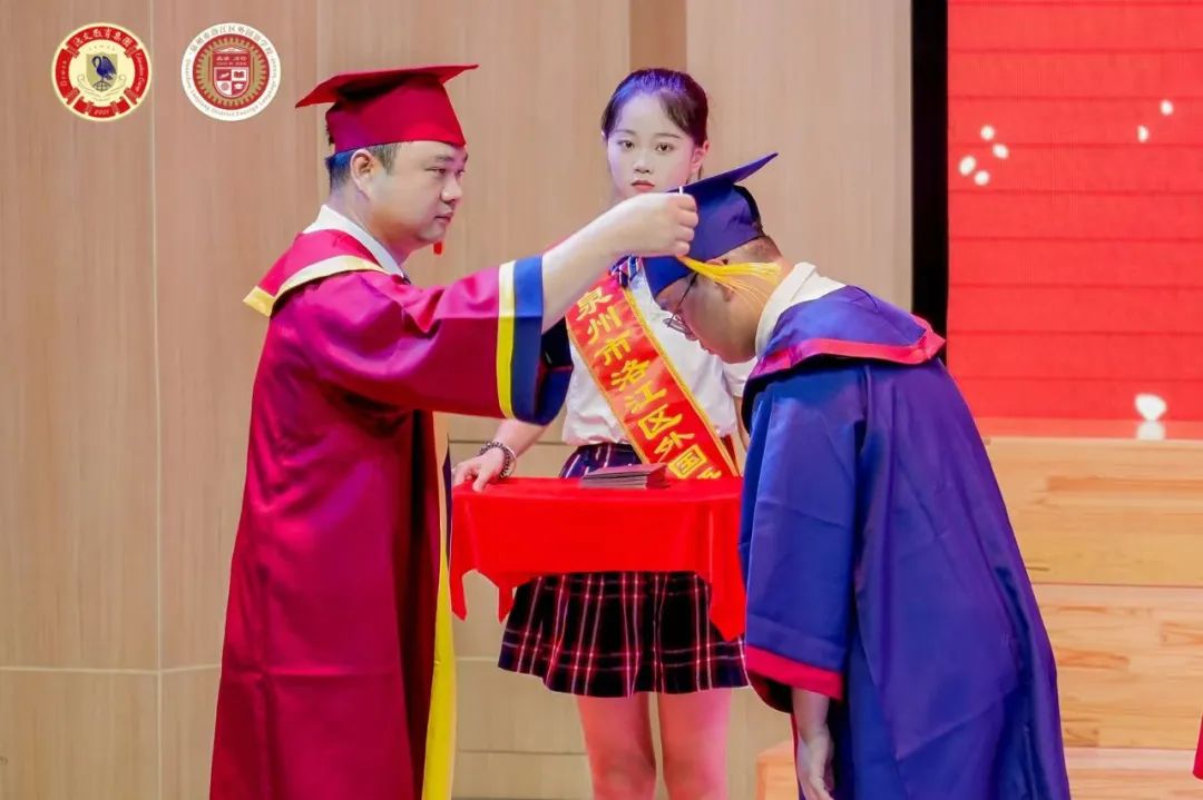 三年寒窗苦读,洛外学子脚踏实地,稳步向前迈进。在所有人目光注视下,一批批优秀毕业生上台。李雄虎执行董事、林建生校长、姚玉铭副校长、小学部潘振平校长、杨俊健校长助理为每位毕业生拨穗正冠,颁发毕业证书,祝福同学们金榜题名、前程似锦。