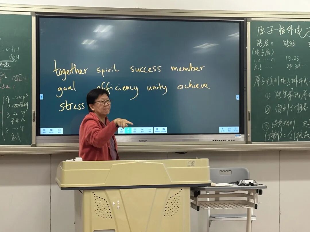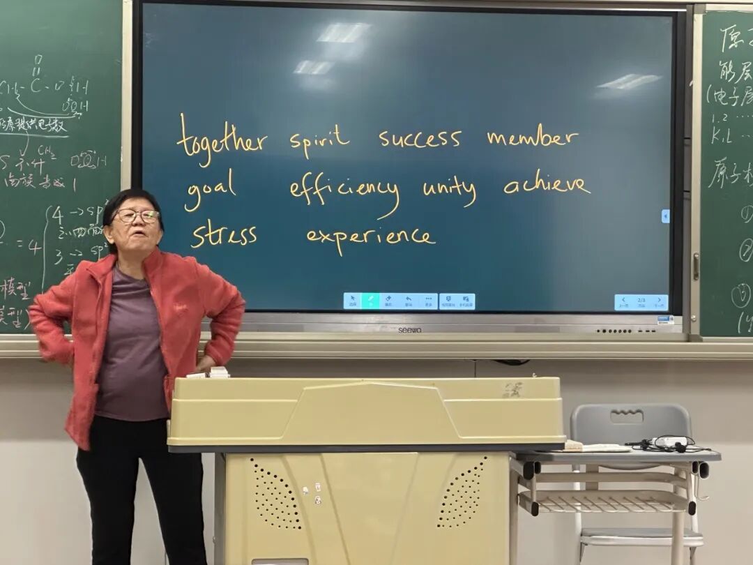 一轮teamwork话题讨论完之后,冯老师让学生回忆刚才每位同学们的发言,选取一个词作为new word,并板书在黑板上,让大家一起学习。