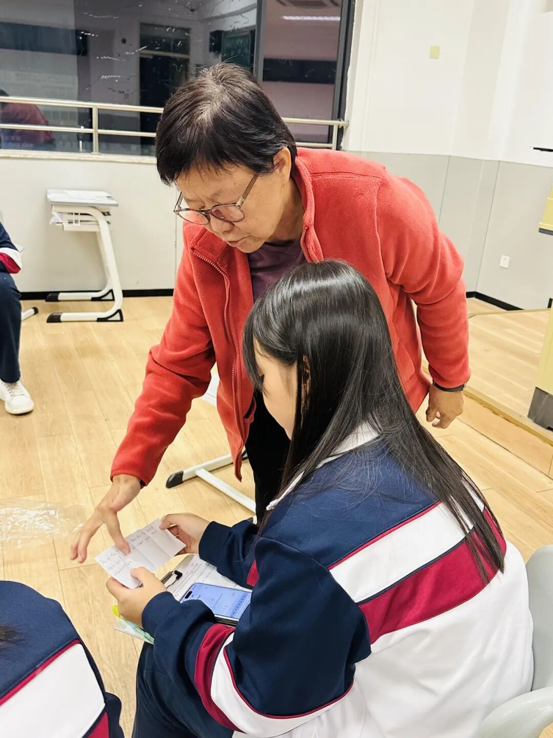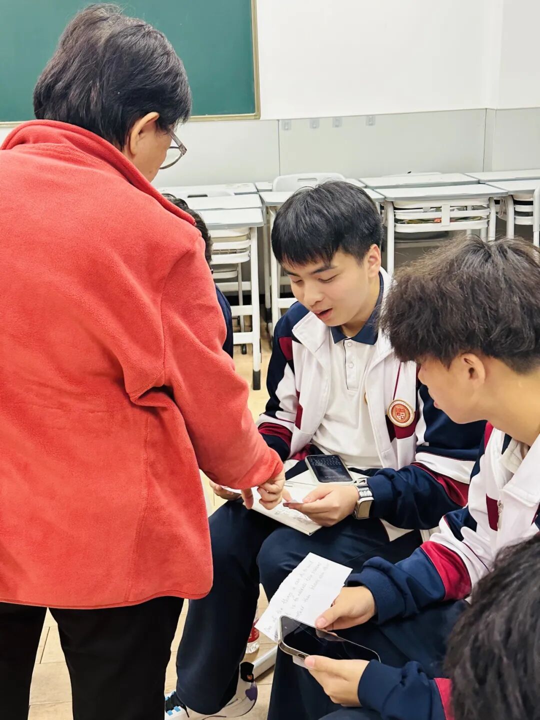 在这个环节里,外教冯老师耐心地指导学生朗读纸条上的内容,矫正学生的发音,让学生自己尝试翻译英文。