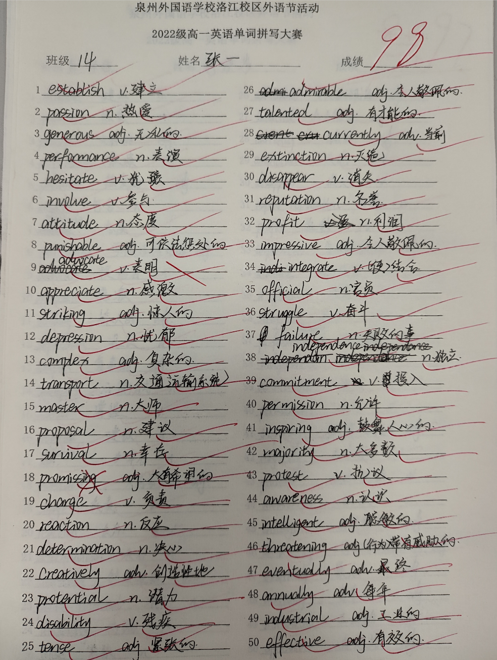 为促进学生英语单词拼写能力的提升;加强学生英语学习中“听”的能力以及快速、准确书写、记录和分析信息的能力;提高学生在真实语境中使用英语语言接受信息运用信息的能力;并且进一步在全校范围内营造重视英语基本技能养成与提升的氛围,我校高一年段于2023年5月11日举行了高中英语单词拼写大赛。